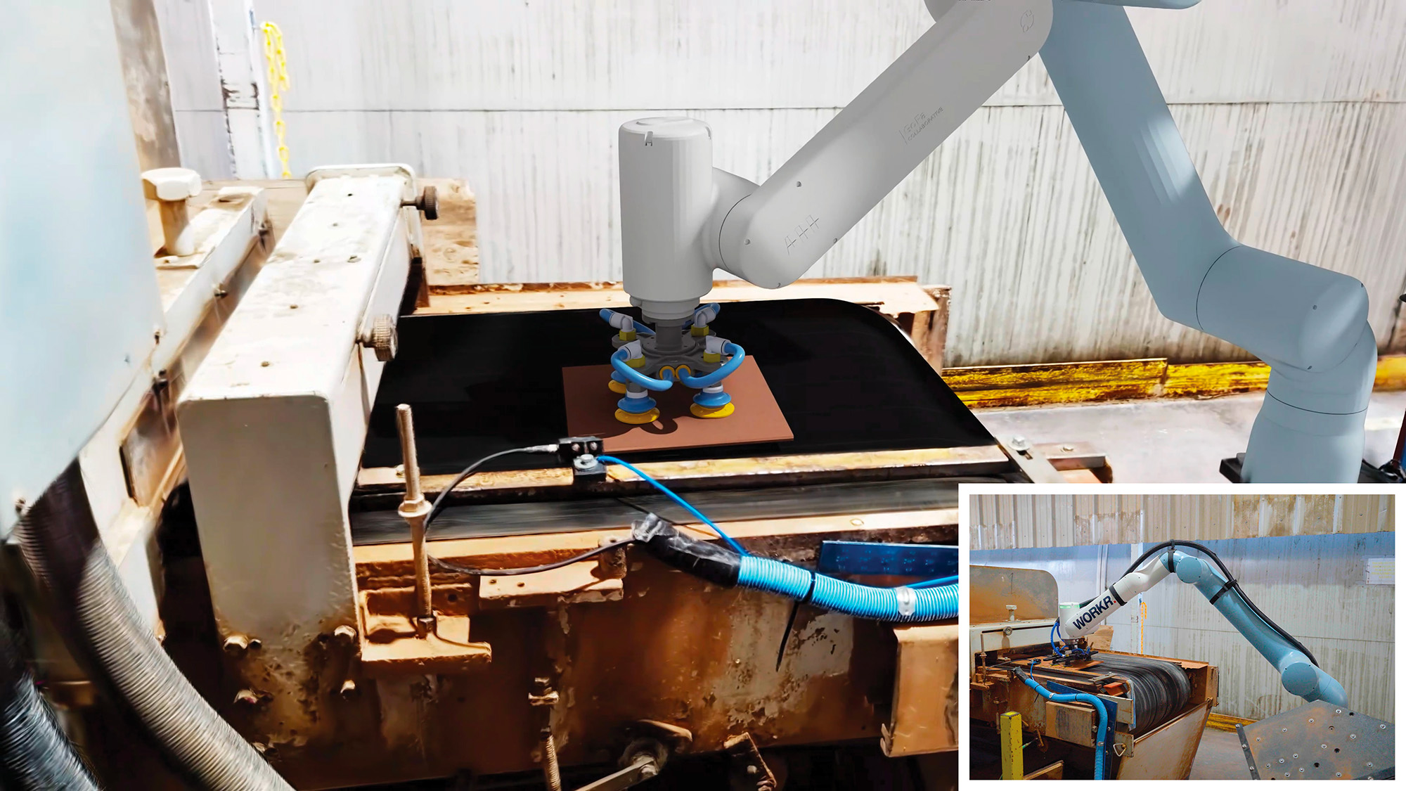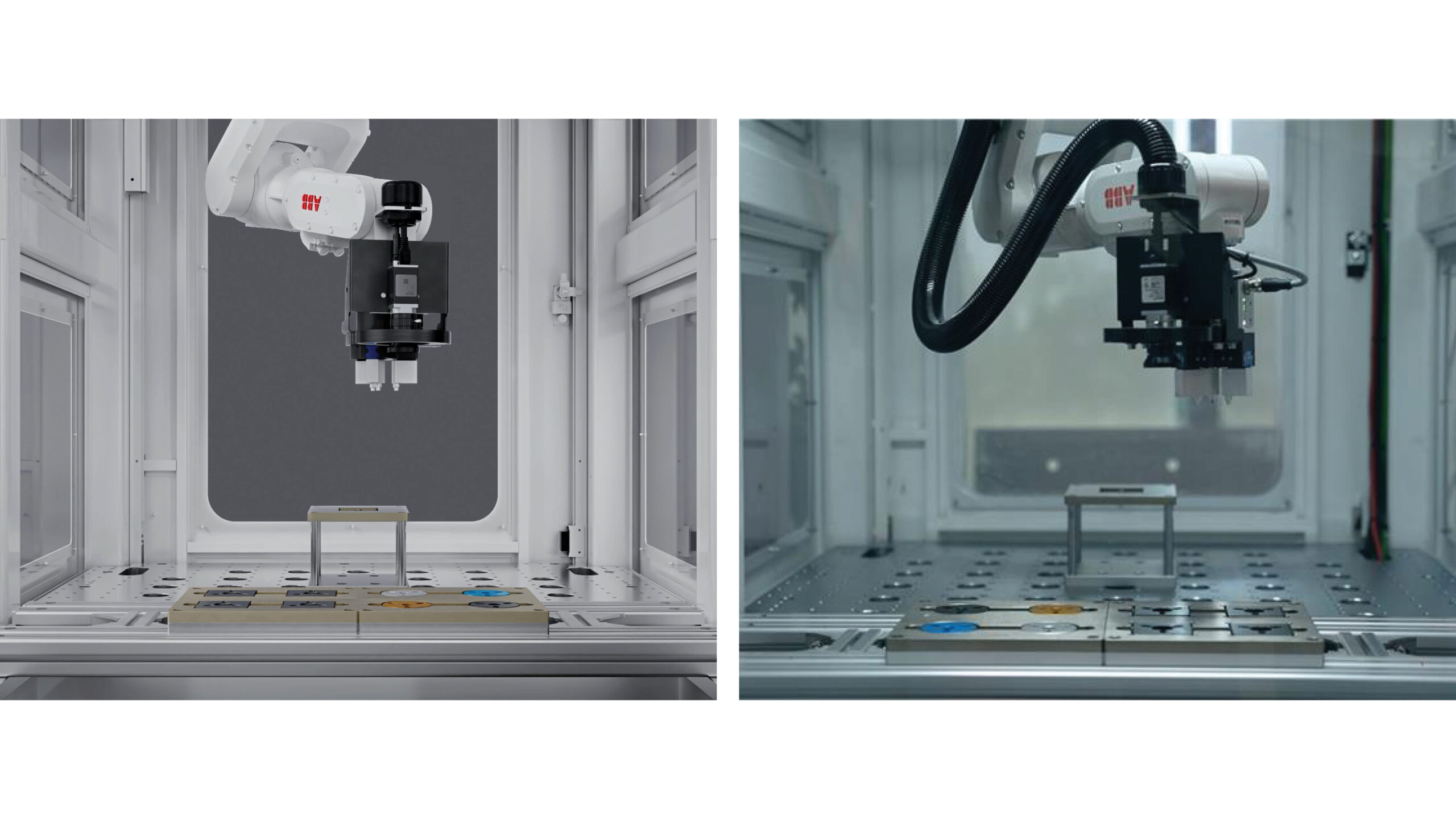 Photo: Nouveau ABB Robotics RobotStudio® HyperReality (gauche) comparé à une image réelle de la même cellule robotisée